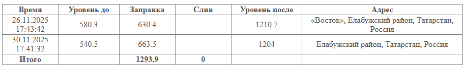Журнал событий: Фиксирует все заправки и сливы с привязкой к координатам и времени. Пример: "16.04.2024, 14:30, КамАЗ-6540. Событие: Заправка. Объем: 350 л. АЗС 'Восток', ул. Ленина, 1".